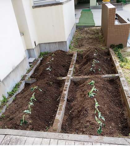 今年も特別支援学級で、校内の庭園の草むしりをしてさつまいもの苗を植えてくれました。また、管理作業員さんも花壇にひまわりの苗とゴーヤの苗を植えてくださいました。