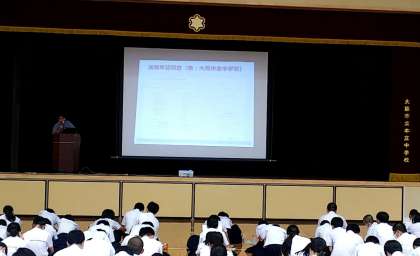3年生は、午後の授業を使って体育館で今後の進路についての説明がありました。生徒はみんな真剣な面持ちで説明を聞いていました。