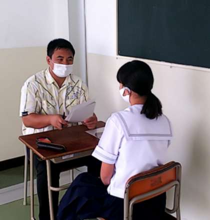 本日の1年生英語の授業では、ネイティブの先生とインタビューテストを行いました。1対1での会話に緊張した面持ちで、熱心にインタビューに臨んでいました。