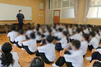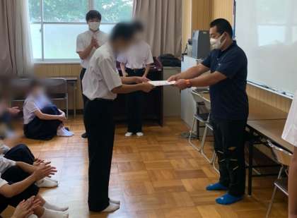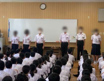 先日行った球技大会の表彰を行いました。1位は3組、2位は2組でした。また、学年主任の先生から1学期をふり返って、自発的に意欲をもって何事にも取り組めるようになろうというお話がありました。