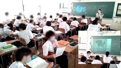 Unit 3 「Career Day」を題材に、スキットを見ながらどんな内容なのか聞き取っています。聞き取った情報について、グループ内で確認しています。