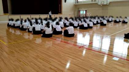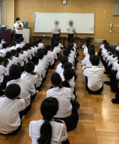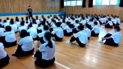 3年 2025年大阪万博のロゴ作者をご存じだという主任の先生。この方は昔から人のために絵を描いたりコツコツ努力をしてきた人だとのこと。生徒の皆さんもコツコツ頑張っていることは必ず誰かが見ていてくれるということ、人とのかかわりを大事にすることは大切だというお話でした。