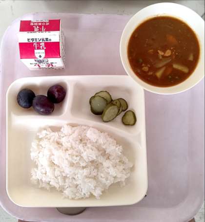 ・ごはん ・牛乳 ・チキンカレーライス[米粉] ・きゅうりのピクルス ・ぶどう(巨峰)