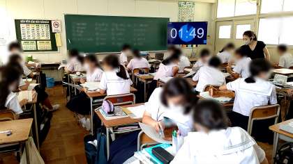 スキットを見ながら教科書本文の内容読解に挑戦しています。どこまで理解できているか生徒同士で確認しています。