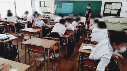 感覚器官のつくりとはたらきについて学習しています。お互いの瞳をのぞき込んで光の加減で瞳孔がどうなるか観察しています。