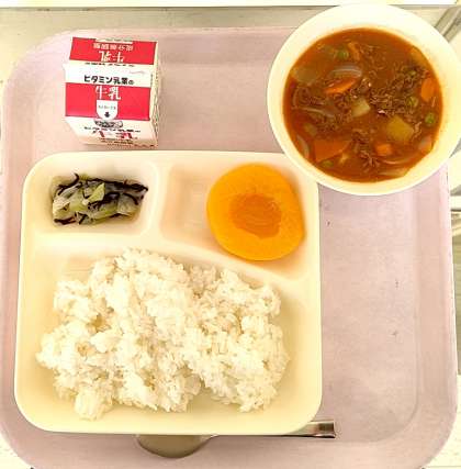 ・ごはん ・牛乳 ・ハヤシライス[米粉] ・キャベツのひじきドレッシング ・黄桃(缶)