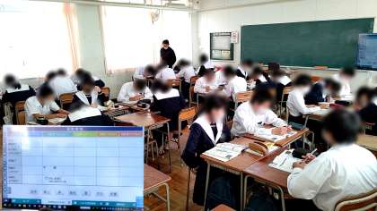脊椎動物の特徴を示した表をグループで確認しながら記入しています。
