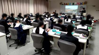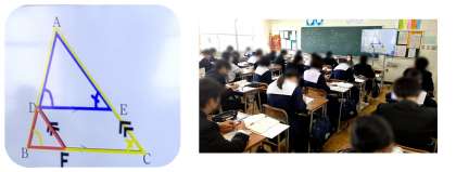 写真のように、青枠で囲った三角形と赤枠で囲った三角形の相似を証明しようと挑戦しています。