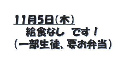 明日11月5日(木)は、6日(金)の文化発表会前日準備のため、午前中のみの授業になります。午後は準備に関係している生徒(一部の委員、係、部活動生徒)以外は、下校となります。