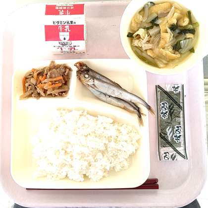 ・ごはん ・牛乳 ・焼きししゃも ・五目汁 ・きんぴらごぼう ・焼きのり(中)