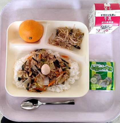 ・ごはん ・牛乳 ・中華丼 ・もやしとさんどまめの中華あえ ・みかん ・まっ茶大豆(中)