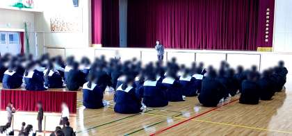修学旅行委員や前期学級役員の生徒たちから全体へ協力のお礼がありました。その後、学年の先生から、修学旅行中、二度ほど集合時間に遅れるということがあり、日常生活での課題がそこでも表れてしまったので、今後も向上をしていきましょう、というお話がありました。