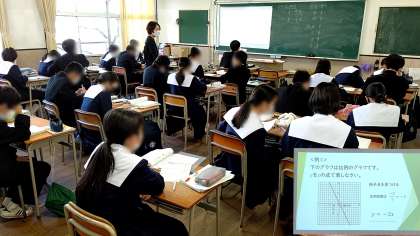 比例のグラフを読み取って、それぞれの直線を式で表すことにチャレンジしています。