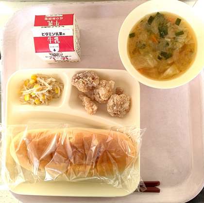 ・おさつパン ・牛乳 ・鶏肉のからあげ ・中華みそスープ ・もやしとコーンの甘酢あえ