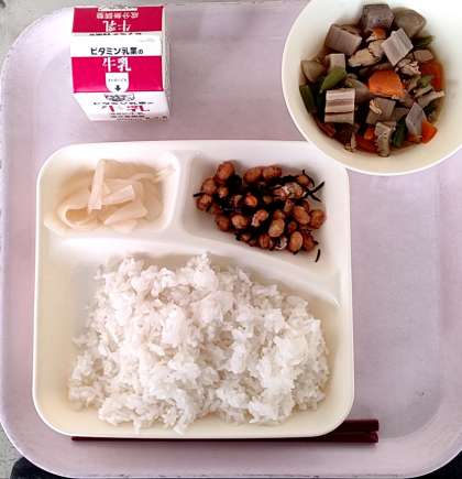本日の給食 ・ごはん ・牛乳 ・筑前煮 ・ひじき豆 ・だいこんのゆず風味