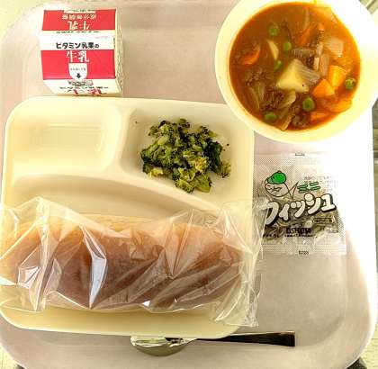本日の給食 ・黒糖パン ・牛乳 ・ビーフシチュー ・ブロッコリーのサラダ ・ミニフィッシュ