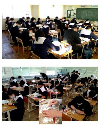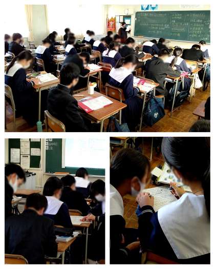 「化学変化とイオン」について学習しています。プリントを使って練習問題に取り組んでいます。早くにわかった人とまだできていない人が教え合いを行っています。