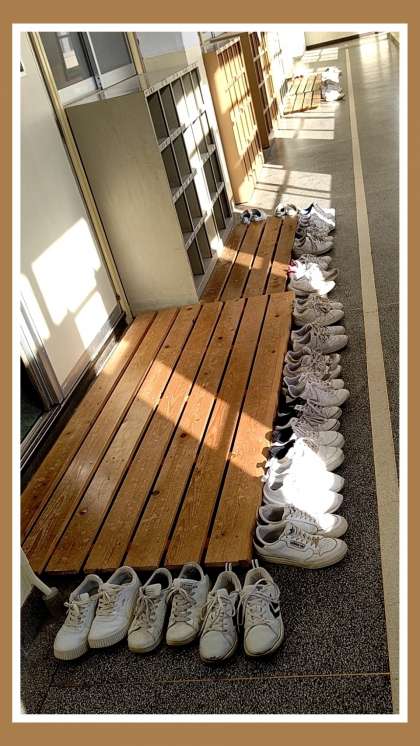 特別教室では土足禁止の教室もあり、生徒は靴を脱いで入室します。誰に言われるでもなく、きちんとそろえられた靴、靴、靴。「履物をそろえると心もそろう」とは、昔に習ったことですが、さすがは3年生、一足として乱れもありません。進路へ向け、卒業へ向け、心の準備も整ってきているのでしょうか。見習いたいものです。