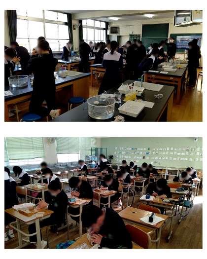 「水上置換法」を使って、化学反応を起こした際にできる気体を抽出する実験をしています。久々の実験に生徒たちの気持ちも高揚します。