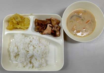本日の給食 1組 ・ごはん ・牛乳 ・鶏肉の甘辛焼き ・かす汁 ・くりきんとん