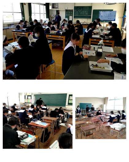 電圧計の使い方について学習した後、実際に操作しています。次回はこの装置を使っていろいろな回路の電圧を計る実験をします。