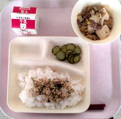本日の給食 ・ごはん ・牛乳 ・すき焼き煮(近江牛) ・きゅうりのゆずの香あえ ・ツナっ葉いため