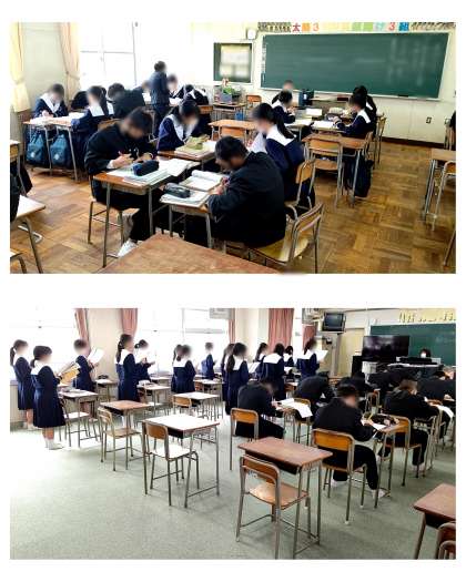 プリント教材を使った学年末テスト対策と「花は咲く」のパート練習を行っています。