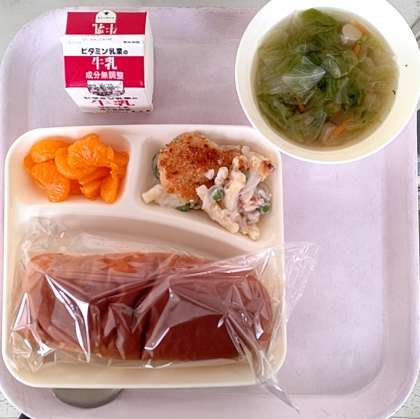 ・黒糖パン ・牛乳 ・マカロニグラタン ・レタスのスープ ・みかん(缶)