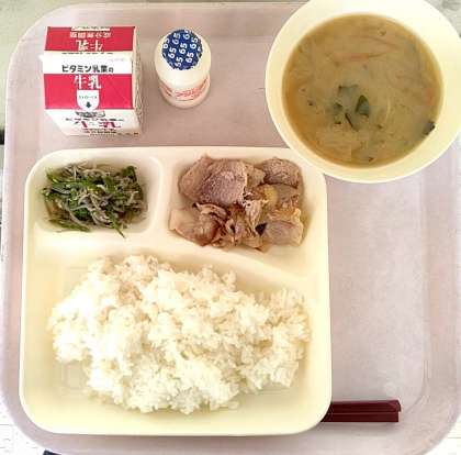 本日の給食 ・ごはん ・牛乳 ・豚肉のしょうが焼き ・みそ汁 ・じゃこピーマン ・発酵乳(中)