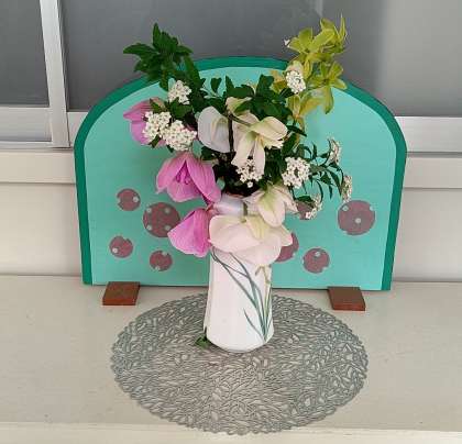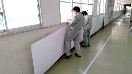 生徒や先生たちが部活動編成をしている中、管理作業員さんが今年も3年生のために進路用ポスターを貼るための掲示板の設置をしてくださっています。また、学校元気アップ支援員さんもいつもきれいな切り花を生けてくださったりいます。