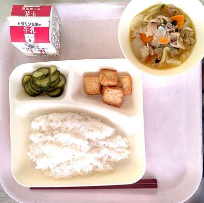 本日の給食 ・ごはん ・牛乳 ・中華煮 ・あつあげのピリ辛じょうゆかけ ・きゅうりの中華あえ