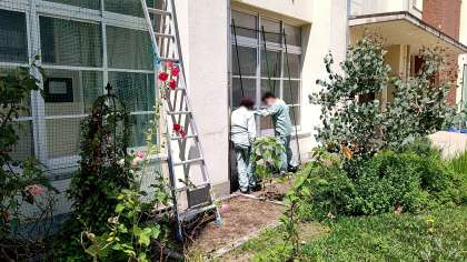 今年もグリーンカーテンの季節がやってきました。管理作業員さんがネットの設置やゴーヤの種まきをしてくださっています。