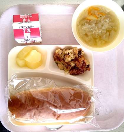 本日の給食 ・黒糖パン ・牛乳 ・カレードリア ・豚肉とキャベツのスープ ・りんご(カット缶)