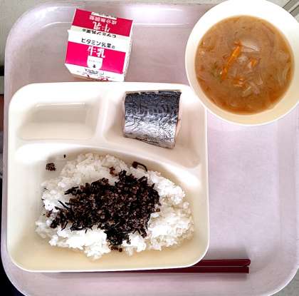 本日の給食 ・ごはん ・牛乳 ・さごしの塩焼き ・みそ汁 ・牛ひじきそぼろ