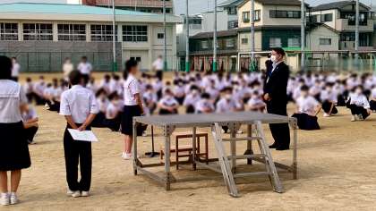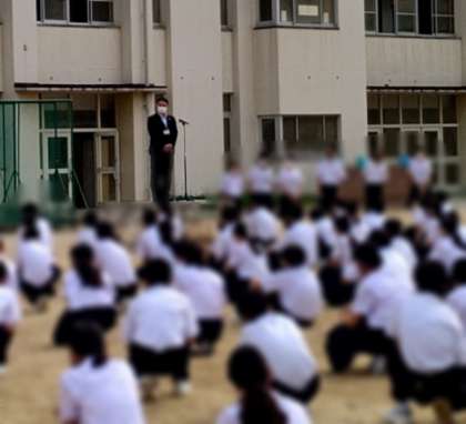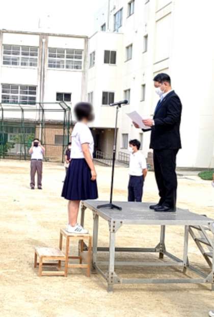 また、全校集会では、先日大阪市中体連主催の柔道大会で階級別優勝した3年女子生徒が表彰され、直接御栗区長から表彰状を受け取りました。