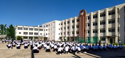 秋晴れの晴天のもと、全校集会を行っています。