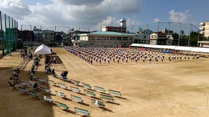 競技場の注意、国旗・校旗掲揚、ラジオ体操第2と続き、校長先生のご挨拶の後、代表生徒が選手宣誓をしています。