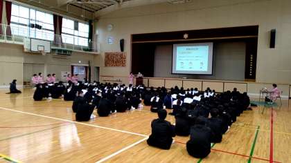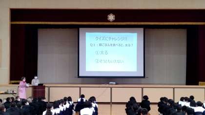 東成区の食育推進委員の皆さんにいらしていただき、「食」の大切さについて学習しています。朝食にはどのような食べ物がいいのか、普段口にする飲料にはどれくらいの砂糖が入っているのか等、クイズも交えながら教えていただきました。