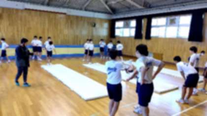 男子の体育では、 マット運動で倒立前転の練習をしています。