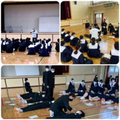 2年生では、防災クイズ「アタック」や、AEDを用いた心臓マッサージの実技訓練をしています。新型コロナウイルス感染症対策を講じながらの心臓マッサージは、訓練の場だけでなく、有事の場面でも命を救う一刻を争うときに大きなハードルとなりうることに気づきます。