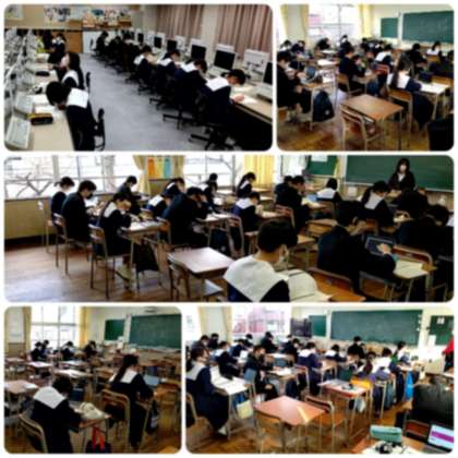 英検全校受検前日、対策に取り組んでいます。タブレット端末が一人ずつ使えるようになったおかげで、リスニング対策も各自のペースで行うことができます。