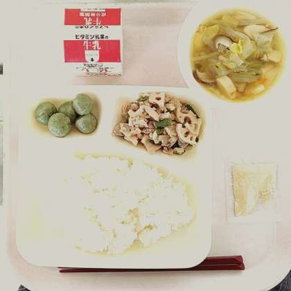本日の給食 ・ごはん ・牛乳 ・豚肉とれんこんの炒め煮 ・五目汁 ・きな粉よもぎ団子