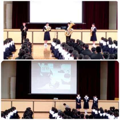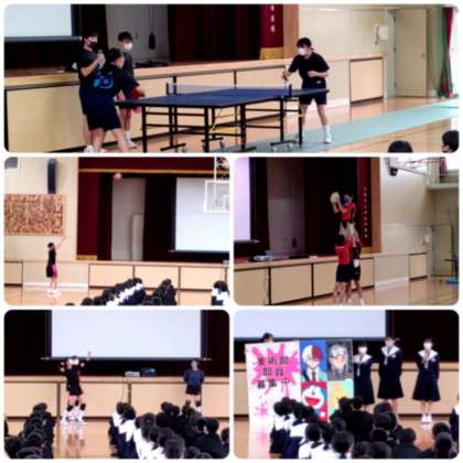 自分達の部活動の良さを伝えようと工夫を凝らした演出で1年生を惹き付けます。1年生は、どの部活動の紹介も食い入るように見ていました。