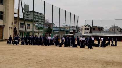 集合時間に向けて、健康観察を終え、生徒たちが続々と運動場に集合しています。