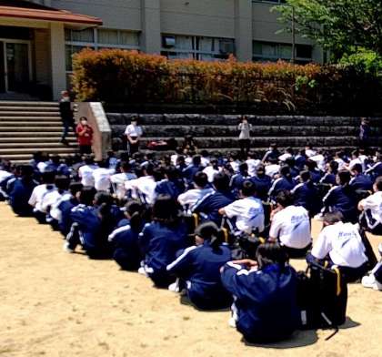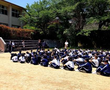 野外炊さんが予定よりも早く終わり、昼食・片付けのあと少し体を動かすこともでき、閉校式を行っています。
