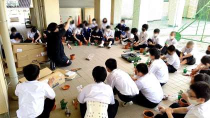 トマトの栽培が始まりました。苗を鉢に移す時の注意を聞いて、実際に一人ひとり苗を移しかえています。初めは多くの生徒が土に触れることに躊躇していましたが、やってみるとなかなか楽しそうです。