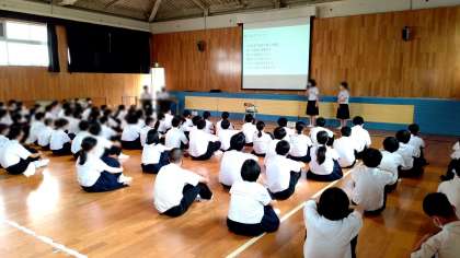 2年生の様子 明日の校外学習へ向けて、連絡や注意することなどを各係から話しています。