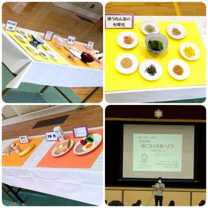 食生活改善推進委員会の皆さんによる食育講座を行っています。どういった食生活がいいのかやバランスの取れた朝食について、委員のみなさんによる手作りの朝食の実例も見せていただきながら学習しました。