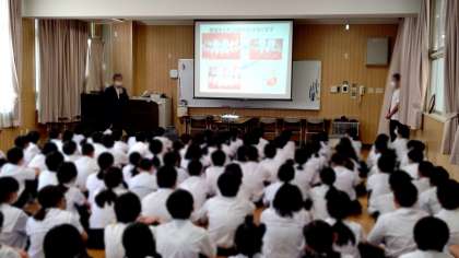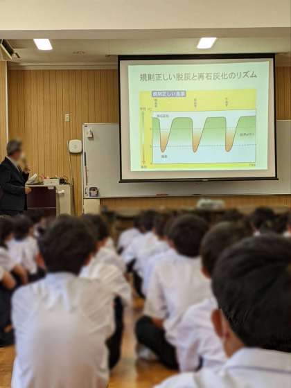 1年生にて、校医先生より歯や口腔内を清潔に保つことの大切さについてなどお話いただいています。