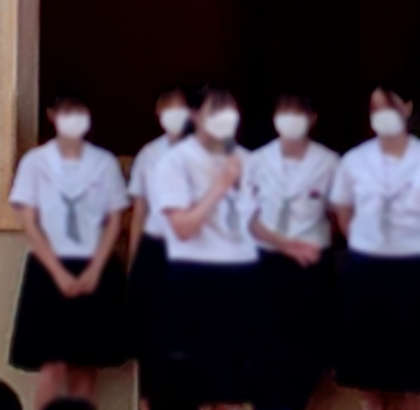 修学旅行を終えて、健康観察や振り返りなどを行っています。体育館では、中心となって運営した生徒一人一人が前へ出て、これまでの感想や協力への感謝を表しています。